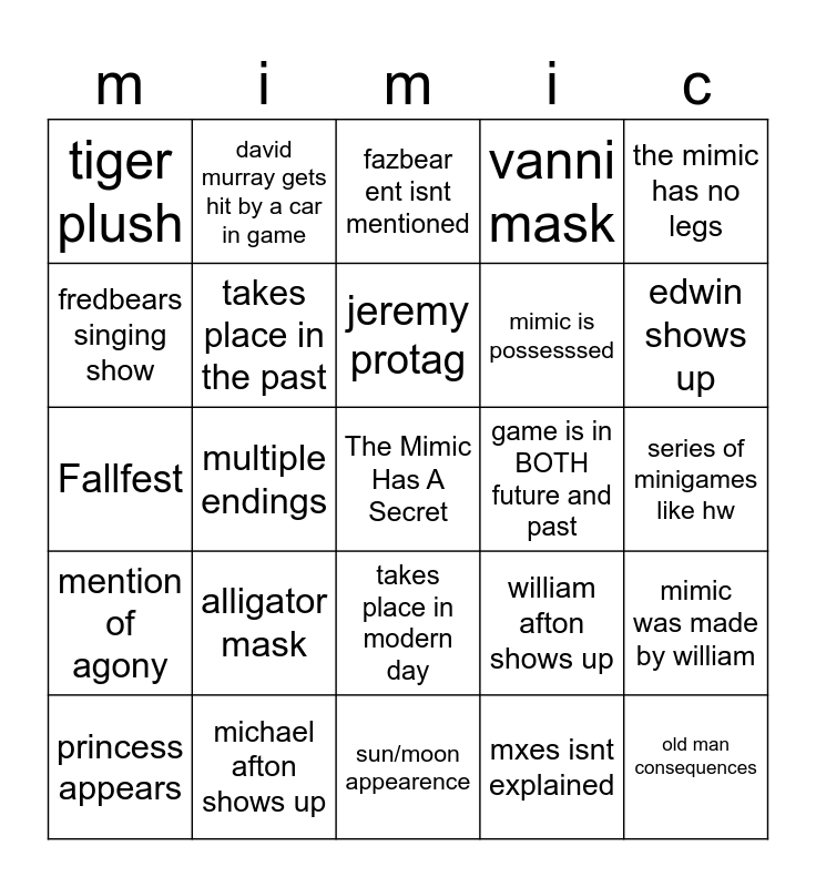 This bingo card has a free space and 24 words: alligator mask, michael afton shows up, jeremy protag, princess appears, the mimic has no legs, tiger plush, fredbears singing show, david murray gets hit by a car in game, game is in BOTH future and past, takes place in modern day, mimic is possesssed, Fallfest, william afton shows up, mimic was made by william, takes place in the past, mxes isnt explained, series of minigames like hw, fazbear ent isnt mentioned, edwin shows up, multiple endings, old man consequences, mention of agony, vanni mask and sun/moon appearence.