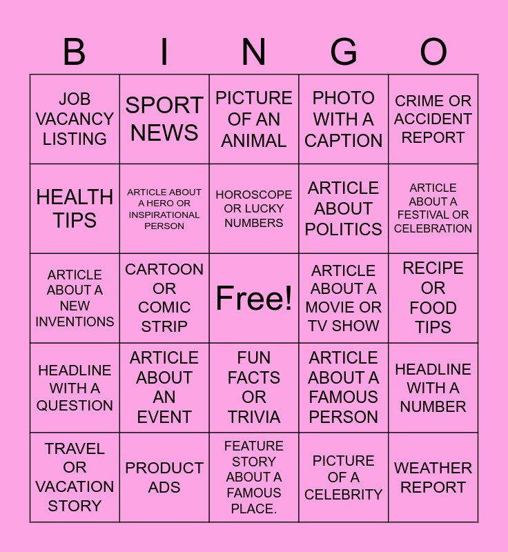 This bingo card has a free space and 24 words: ARTICLE ABOUT AN EVENT, PRODUCT ADS, HOROSCOPE OR LUCKY NUMBERS, TRAVEL OR VACATION STORY, CRIME OR ACCIDENT REPORT, JOB VACANCY LISTING, HEALTH TIPS, SPORT NEWS, ARTICLE ABOUT A MOVIE OR TV SHOW, FUN FACTS OR TRIVIA, ARTICLE ABOUT POLITICS, ARTICLE ABOUT A NEW INVENTIONS, ARTICLE ABOUT A FAMOUS PERSON, HEADLINE WITH A NUMBER, ARTICLE ABOUT A HERO OR INSPIRATIONAL PERSON, PICTURE OF A CELEBRITY, RECIPE OR FOOD TIPS, PICTURE OF AN ANIMAL, ARTICLE ABOUT A FESTIVAL OR CELEBRATION, CARTOON OR COMIC STRIP, WEATHER REPORT, HEADLINE WITH A QUESTION, PHOTO WITH A CAPTION and FEATURE STORY ABOUT A FAMOUS PLACE..