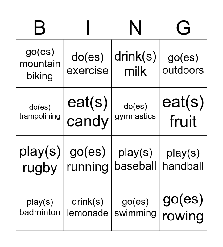 This bingo card has 16 words: drink(s) lemonade, play(s) handball, drink(s) milk, go(es) mountain biking, play(s) rugby, do(es) exercise, play(s) baseball, go(es) swimming, do(es) trampolining, eat(s) candy, play(s) badminton, go(es) outdoors, go(es) running, eat(s) fruit, do(es) gymnastics and go(es) rowing.