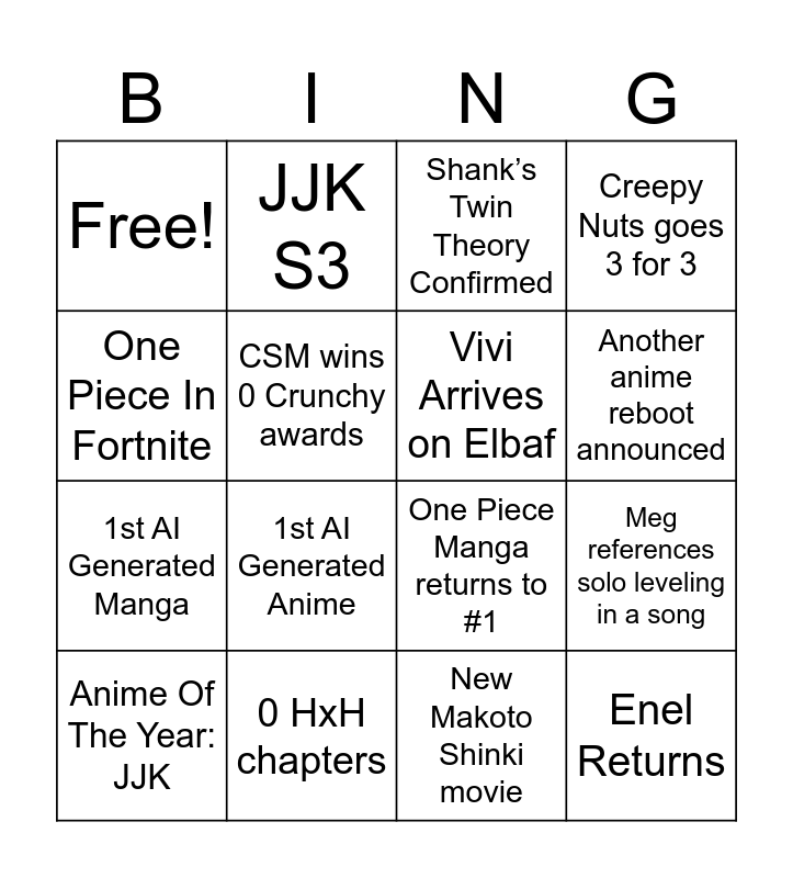 This bingo card has 16 words: Anime Of The Year: JJK, 0 HxH chapters, Shank’s Twin Theory Confirmed, Creepy Nuts goes 3 for 3, One Piece In Fortnite, JJK S3, One Piece Manga returns to #1, Meg references solo leveling in a song, Free!, CSM wins 0 Crunchy awards, New Makoto Shinki movie, Another anime reboot announced, 1st AI Generated Manga, 1st AI Generated Anime, Vivi Arrives on Elbaf and Enel Returns.
