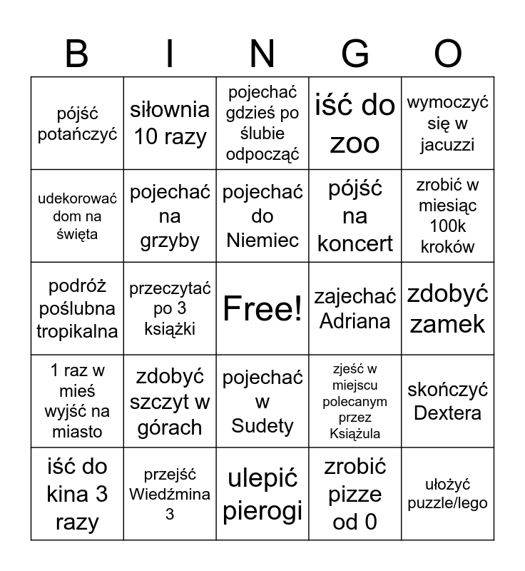 This bingo card has a free space and 24 words: zdobyć szczyt w górach, przejść Wiedźmina 3, pojechać do Niemiec, iść do kina 3 razy, wymoczyć się w jacuzzi, pójść potańczyć, udekorować dom na święta, siłownia 10 razy, zajechać Adriana, pojechać w Sudety, pójść na koncert, podróż poślubna tropikalna, zjeść w miejscu polecanym przez Książula, skończyć Dextera, pojechać na grzyby, zrobić pizze od 0, zdobyć zamek, pojechać gdzieś po ślubie odpocząć, zrobić w miesiąc 100k kroków, przeczytać po 3 książki, ułożyć puzzle/lego, 1 raz w mieś wyjść na miasto, iść do zoo and ulepić pierogi.