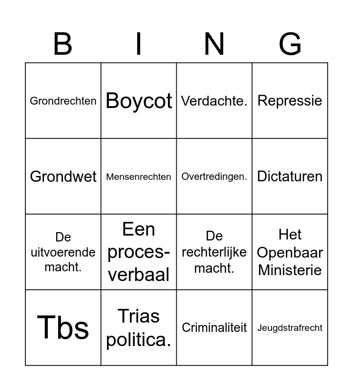 This bingo card has 25 words: Een rechtsstaat, Autoritaire staten, Dictaturen, Censuur., Grondwet, Grondrechten, Mensenrechten, Boycot, Trias politica., De wetgevende macht, De uitvoerende macht., De rechterlijke macht., Het legaliteitsbeginsel, Het strafrecht, Overtredingen., Misdrijven, Criminaliteit, Verdachte., Een proces-verbaal, Het Openbaar Ministerie, Tbs, Ontoerekeningsvatbaar, Jeugdstrafrecht, Repressie and Preventie.