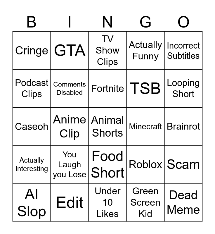 This bingo card has a free space and 24 words: You Laugh you Lose, Edit, Fortnite, AI Slop, Incorrect Subtitles, Cringe, Podcast Clips, GTA, Minecraft, Food Short, TSB, Caseoh, Roblox, Scam, Comments Disabled, Green Screen Kid, Brainrot, TV Show Clips, Looping Short, Anime Clip, Dead Meme, Actually Interesting, Actually Funny and Under 10 Likes.