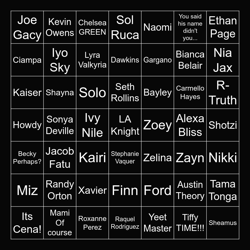 This bingo card has 49 words: Austin Theory, Bianca Belair, Yeet Master, Sonya Deville, Solo, Shotzi, Kevin Owens, Roxanne Perez, You said his name didn't you..., Stephanie Vaquer, Ethan Page, Sol Ruca, Carmello Hayes, Bayley, Randy Orton, Alexa Bliss, Ciampa, Nia Jax, Tama Tonga, Naomi, Gargano, Ivy Nile, Joe Gacy, Iyo Sky, Its Cena!, Lyra Valkyria, R-Truth, Mami Of course, Seth Rollins, Shayna, Sheamus, Zoey, Miz, Xavier, Howdy, Zelina, Zayn, Nikki, Kaiser, Kairi, Finn, Becky Perhaps?, LA Knight, Raquel Rodriguez, Dawkins, Chelsea GREEN, Ford, Jacob Fatu and Tiffy TIME!!!.