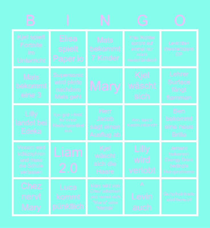This bingo card has a free space and 24 words: Liam 2.0, Luca kommt pünktlich, Mary, Chez nervt Mary, Levin/Ben Weisheitszahn OP, Kjel spielt Fortnite im Unterricht, Mats bekommt eine 3, Elisa spielt Paper.io, Ben macht Karateunterricht, Kjel wäscht sich die Haare, Kjel wäscht sich, Lilly landet bei Edeka, Lilly wird verlobt, Jemand bekommt Energy Drink bedingte Herzprobleme, Supersonic wird pleite nachdem Mats geht, ^ Levin auch, Ben bekommt eine neue Brille, Mats bekommt 7 Kinder, Lehrer Surface fängt flammen, Kjel gibt >300€ für einen Kleidungsartikel aus, Gutscheinkarte wird benutzt, Vincent wird schizophren und muss die Schule verlassen, Frau Richter spricht auf einmal nur noch niederländisch and Mary wird von Chez adoptiert und nennt sich "Maria" oder "Matilda".