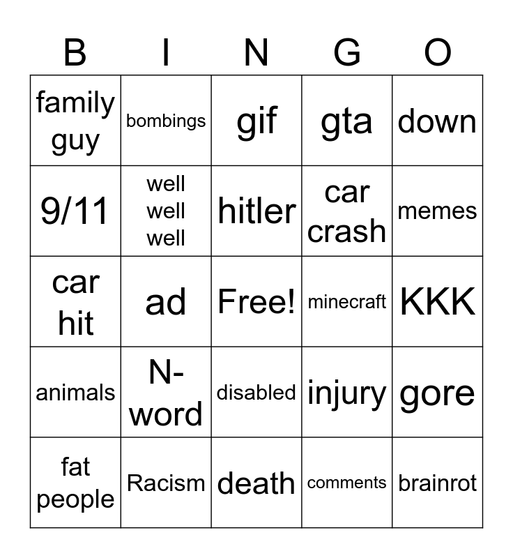 This bingo card has a free space and 24 words: N-word, Racism, hitler, fat people, down, family guy, 9/11, bombings, minecraft, disabled, car crash, car hit, injury, gore, well well well, comments, KKK, gif, memes, ad, brainrot, animals, gta and death.