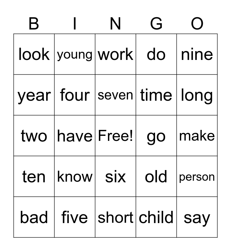 This bingo card has a free space and 40 words: one, two, three, four, five, six, seven, eight, nine, ten, have, do, say, make, go, know, see, look, find, work, person, child, time, year, thing, world, hand, eye, number, street, good, bad, new, old, long, short, big, small, young and strong.