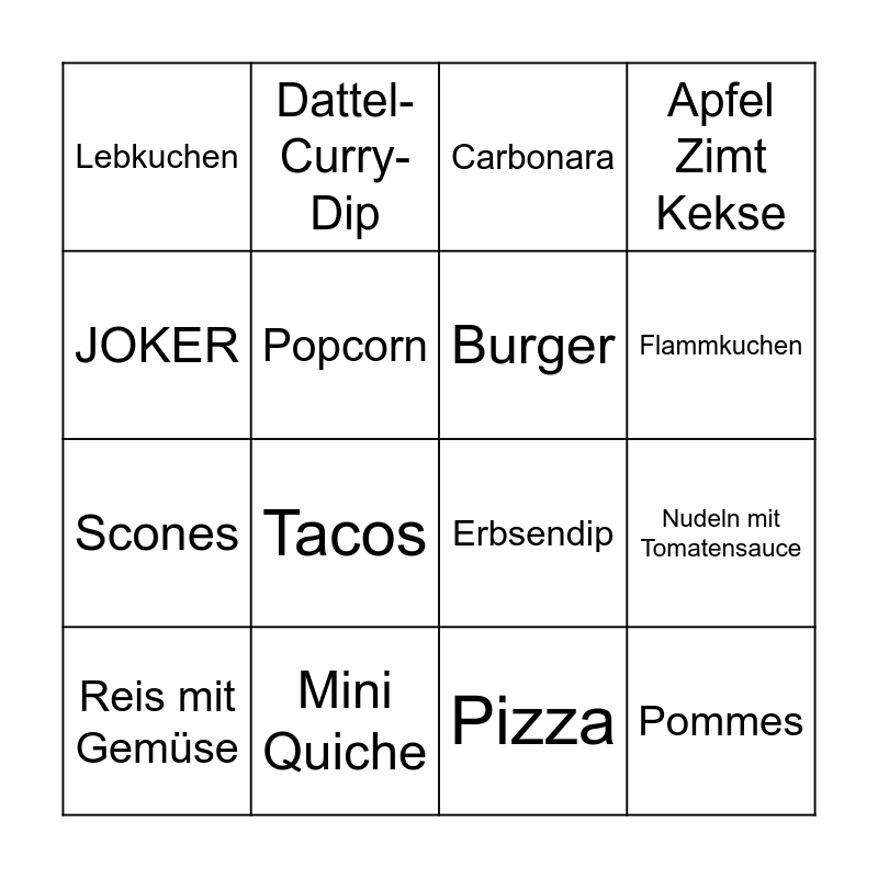 This bingo card has 16 words: Mini Quiche, Nudeln mit Tomatensauce, Carbonara, Lebkuchen, Scones, Dattel-Curry-Dip, Erbsendip, Pizza, JOKER, Popcorn, Reis mit Gemüse, Apfel Zimt Kekse, Tacos, Flammkuchen, Burger and Pommes.