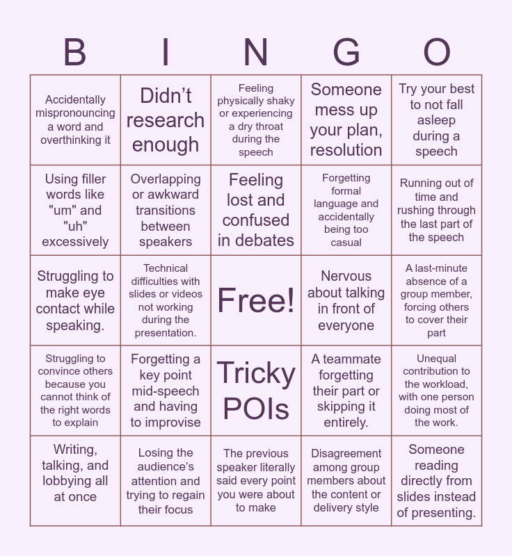 This bingo card has a free space and 24 words: Forgetting a key point mid-speech and having to improvise, Losing the audience’s attention and trying to regain their focus, Feeling lost and confused in debates, Writing, talking, and lobbying all at once, Try your best to not fall asleep during a speech, Accidentally mispronouncing a word and overthinking it, Using filler words like "um" and "uh" excessively, Didn’t research enough, Nervous about talking in front of everyone, Tricky POIs, Forgetting formal language and accidentally being too casual, Struggling to make eye contact while speaking., A teammate forgetting their part or skipping it entirely., Unequal contribution to the workload, with one person doing most of the work., Overlapping or awkward transitions between speakers, Disagreement among group members about the content or delivery style, A last-minute absence of a group member, forcing others to cover their part, Feeling physically shaky or experiencing a dry throat during the speech, Running out of time and rushing through the last part of the speech, Technical difficulties with slides or videos not working during the presentation., Someone reading directly from slides instead of presenting., Struggling to convince others because you cannot think of the right words to explain, Someone mess up your plan, resolution and The previous speaker literally said every point you were about to make.