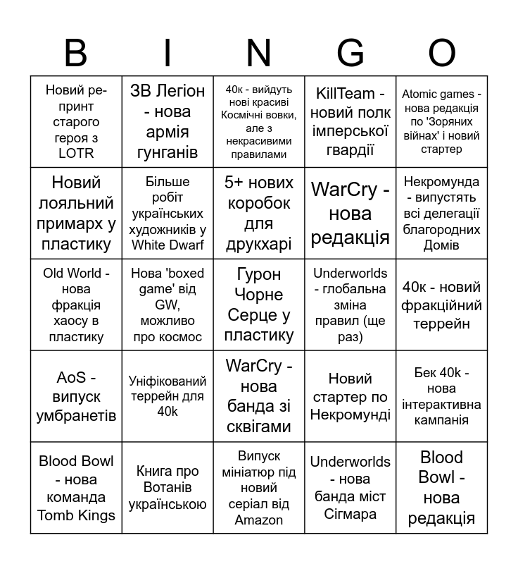 This bingo card has a free space and 24 words: Уніфікований террейн для 40k, Книга про Вотанів українською, 5+ нових коробок для друкхарі, Blood Bowl - нова команда Tomb Kings, Atomic games - нова редакція по 'Зоряних війнах' і новий стартер, Новий ре-принт старого героя з LOTR, Новий лояльний примарх у пластику, ЗВ Легіон - нова армія гунганів, Underworlds - глобальна зміна правил (ще раз), WarCry - нова банда зі сквігами, WarCry - нова редакція, Old World - нова фракція хаосу в пластику, Новий стартер по Некромунді, Бек 40k - нова інтерактивна кампанія, Більше робіт українських художників у White Dwarf, Underworlds - нова банда міст Сігмара, 40к - новий фракційний террейн, 40к - вийдуть нові красиві Космічні вовки, але з некрасивими правилами, Некромунда - випустять всі делегації благородних Домів, Нова 'boxed game' від GW, можливо про космос, Blood Bowl - нова редакція, AoS - випуск умбранетів, KillTeam - новий полк імперської гвардії and Випуск мініатюр під новий серіал від Amazon.