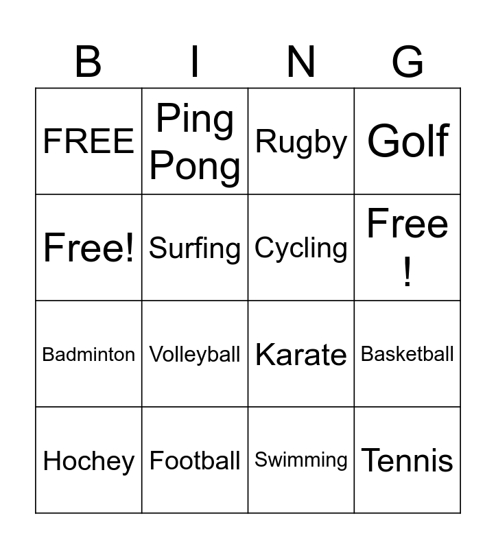 This bingo card has 16 words: Football, Basketball, Rugby, FREE, Badminton, Ping Pong, Karate, Swimming, Free!, Surfing, Hochey, Golf, Volleyball, Free !, Cycling and Tennis.
