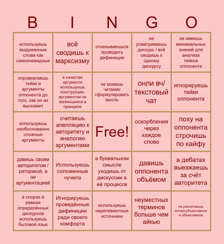 This bingo card has a free space and 24 words: Используешь соломенные чучела, Игнорируешь проведённые дефиниции ради своего комфорта, не можешь читаемо сформулировать мысль, в спорах в рамках определённых дискурсов используешь бытовой язык, не имеешь минимальных знаний для анализа тейков оппонента, используешь выдуманные слова как самоочевидные, опровергаешь тейки и аргументы оппонента до того, как он их выскажет, всё сводишь к марксизму, оскорбления через каждое слово, в буквальном смысле уходишь от дискуссии в её процессе, онли вч/текстовый чат, используешь необоснованно сложные аргументы, давишь оппонента объёмом, в дебатах выезжаешь за счёт авторитета, в качестве аргумента используешь конструкции, аргументом не являющиеся в принципе, неуместных терминов больше чем айкью, поху на оппонента строчишь по кайфу, отказываешься проводить дефиниции, игнорируешь тейки оппонента, считаешь апелляцию к авторитету и аналогию аргументами, не различаешь интерсубъективное и объективное, давишь своим авторитетом / риторикой, а не аргументацией, не усматриваешь дискурс / всё сводишь к одному дискурсу and используешь нерелевантные источники.