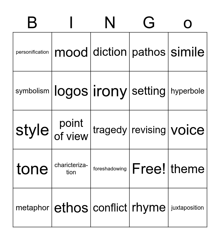 This bingo card has 25 words: charicteriza-tion, conflict, irony, metaphor, simile, personification, symbolism, mood, revising, foreshadowing, setting, style, Free!, theme, logos, juxtaposition, voice, diction, hyperbole, point of view, tragedy, ethos, tone, pathos and rhyme.