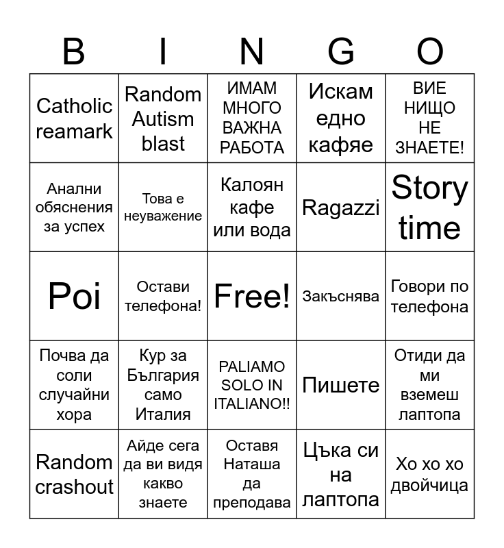 This bingo card has a free space and 24 words: Кур за България само Италия, Айде сега да ви видя какво знаете, Калоян кафе или вода, Random crashout, ВИЕ НИЩО НЕ ЗНАЕТЕ!, Catholic reamark, Анални обяснения за успех, Random Autism blast, Закъснява, PALIAMO SOLO IN ITALIANO!!, Ragazzi, Poi, Пишете, Отиди да ми вземеш лаптопа, Това е неуважение, Цъка си на лаптопа, Говори по телефона, ИМАМ МНОГО ВАЖНА РАБОТА, Story time, Остави телефона!, Хо хо хо двойчица, Почва да соли случайни хора, Искам едно кафяе and Оставя Наташа да преподава.