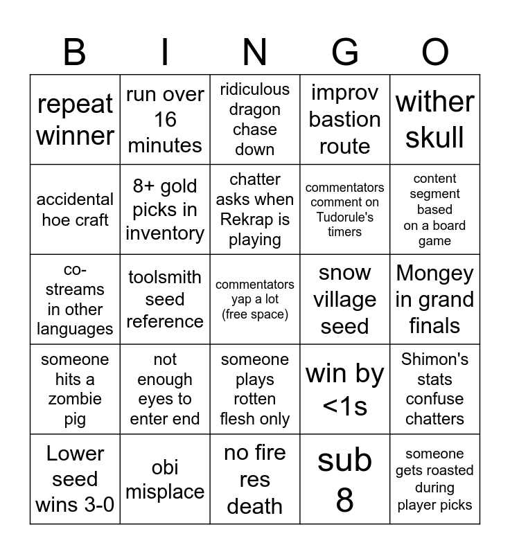 This bingo card has a free space and 29 words: Lower seed wins 3-0, 1 minute timeloss to not seeing nether enter, toolsmith seed reference, quals player wins first match, repeat winner, ridiculous dragon chase down, 8+ gold picks in inventory, not enough eyes to enter end, snow village seed, obi misplace, Mongey in grand finals, someone gets roasted during player picks, no fire res death, sub 8, content segment based on a board game, scuffed end island, someone plays rotten flesh only, someone hits a zombie pig, wither skull, co-streams in other languages, win by <1s, pop culture reference in Fulham analysis, commentators comment on Tudorule's timers, accidental hoe craft, improv bastion route, run over 16 minutes, Shimon's stats confuse chatters, chatter asks when Rekrap is playing and blind on a structure.