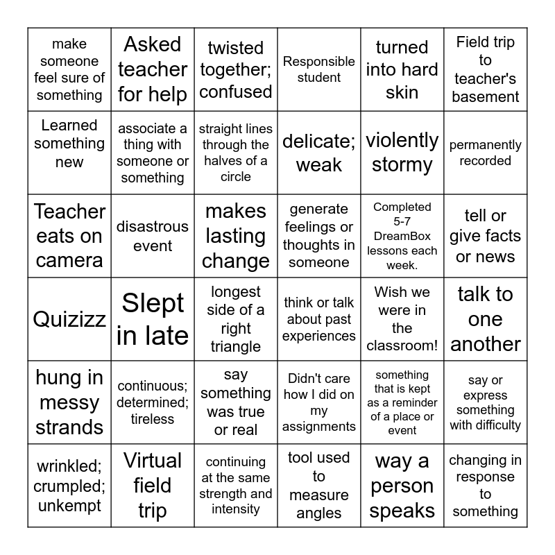 This bingo card has 47 words: Free!, Teacher eats on camera, "You're still sharing", Wish we were in the classroom!, Completed 5-7 DreamBox lessons each week., Didn't care how I did on my assignments, Asked teacher for help, Watched teacher eat my prize, Field trip to teacher's basement, Virtual field trip, Learned something new, Responsible student, Slept in late, Quizizz, way a person speaks, say something was true or real, associate a thing with someone or something, disastrous event, turned into bone, turned into hard skin, permanently recorded, talk to one another, make someone feel sure of something, straight lines through the halves of a circle, physical or mental exhaustion, delicate; weak, longest side of a right triangle, persuade or cause, tell or give facts or news, generate feelings or thoughts in someone, having or showing no pity, continuous; determined; tireless, tool used to measure angles, changing in response to something, continuing at the same strength and intensity, think or talk about past experiences, makes lasting change, wrinkled; crumpled; unkempt, in an embarrassed way, something that is kept as a reminder of a place or event, hung in messy strands, twisted together; confused, violently stormy, afflicted with great pain or suffering, to change; become something else, say or express something with difficulty and in a tired way.