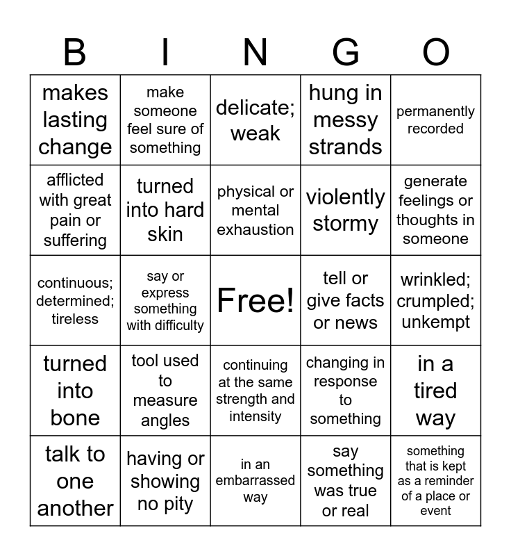 This bingo card has a free space and 34 words: way a person speaks, say something was true or real, associate a thing with someone or something, disastrous event, turned into bone, turned into hard skin, permanently recorded, talk to one another, make someone feel sure of something, straight lines through the halves of a circle, physical or mental exhaustion, delicate; weak, longest side of a right triangle, persuade or cause, tell or give facts or news, generate feelings or thoughts in someone, having or showing no pity, continuous; determined; tireless, tool used to measure angles, changing in response to something, continuing at the same strength and intensity, think or talk about past experiences, makes lasting change, wrinkled; crumpled; unkempt, in an embarrassed way, something that is kept as a reminder of a place or event, hung in messy strands, twisted together; confused, violently stormy, afflicted with great pain or suffering, to change; become something else, say or express something with difficulty, in a tired way and pleasing;satisfying.