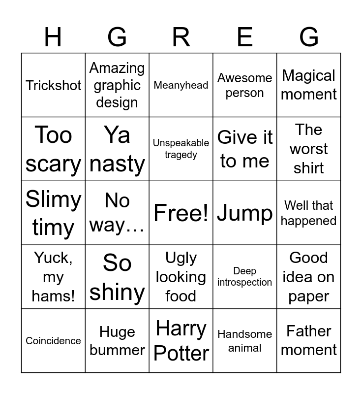This bingo card has a free space and 24 words: So shiny, Huge bummer, Unspeakable tragedy, Coincidence, Magical moment, Trickshot, Too scary, Amazing graphic design, Jump, Ugly looking food, Give it to me, Slimy timy, Deep introspection, Good idea on paper, Ya nasty, Handsome animal, Well that happened, Meanyhead, The worst shirt, No way…, Father moment, Yuck, my hams!, Awesome person and Harry Potter.