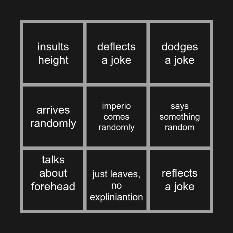 This bingo card has 9 words: talks about forehead, imperio comes randomly, dodges a joke, insults height, deflects a joke, says something random, arrives randomly, just leaves, no expliniantion and reflects a joke.