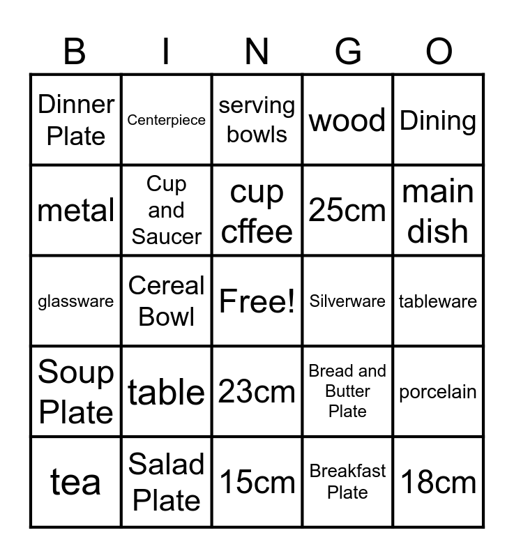 This bingo card has a free space and 30 words: Salad Plate, Demitasse Cup, Cereal Bowl, Dinnerware, Dinner Plate, serving bowls, Cup and Saucer, 23cm, Silverware, 15cm, tableware, 18cm, Breakfast Plate, linen, main dish, Show Plate, Bread and Butter Plate, Soup Plate, table, Dining, glassware, 30cm, Centerpiece, 25cm, metal, wood, porcelain, tea, cup cffee and dessert.