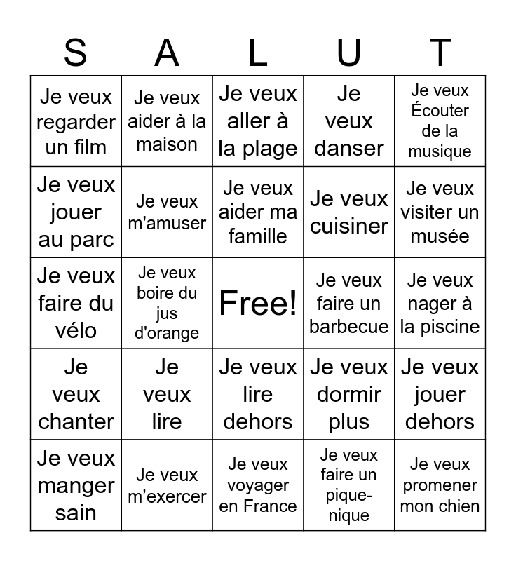 This bingo card has a free space and 24 words: Je veux lire, Je veux m’exercer, Je veux aider ma famille, Je veux manger sain, Je veux Écouter de la musique, Je veux regarder un film, Je veux jouer au parc, Je veux aider à la maison, Je veux faire un barbecue, Je veux lire dehors, Je veux cuisiner, Je veux faire du vélo, Je veux dormir plus, Je veux jouer dehors, Je veux m'amuser, Je veux faire un pique-nique, Je veux nager à la piscine, Je veux aller à la plage, Je veux visiter un musée, Je veux boire du jus d'orange, Je veux promener mon chien, Je veux chanter, Je veux danser and Je veux voyager en France.