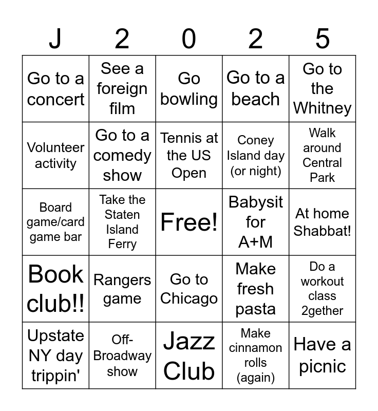This bingo card has a free space and 24 words: Rangers game, Off-Broadway show, Tennis at the US Open, Upstate NY day trippin', Go to the Whitney, Go to a concert, Volunteer activity, See a foreign film, Babysit for A+M, Go to Chicago, Coney Island day (or night), Board game/card game bar, Make fresh pasta, Do a workout class 2gether, Go to a comedy show, Make cinnamon rolls (again), At home Shabbat!, Go bowling, Walk around Central Park, Take the Staten Island Ferry, Have a picnic, Book club!!, Go to a beach and Jazz Club.