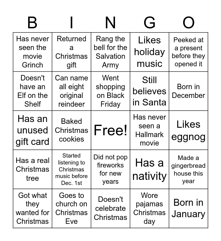 This bingo card has a free space and 24 words: Got what they wanted for Christmas, Started listening to Christmas music before Dec. 1st, Went shopping on Black Friday, Wore pajamas Christmas day, Peeked at a present before they opened it, Has never seen the movie Grinch, Returned a Christmas gift, Rang the bell for the Salvation Army, Has never seen a Hallmark movie, Likes eggnog, Has an unused gift card, Can name all eight original reindeer, Has a nativity, Made a gingerbread house this year, Doesn't have an Elf on the Shelf, Goes to church on Christmas Eve, Doesn't celebrate Christmas, Likes holiday music, Born in December, Has a real Christmas tree, Baked Christmas cookies, Did not pop fireworks for new years, Still believes in Santa and Born in January.