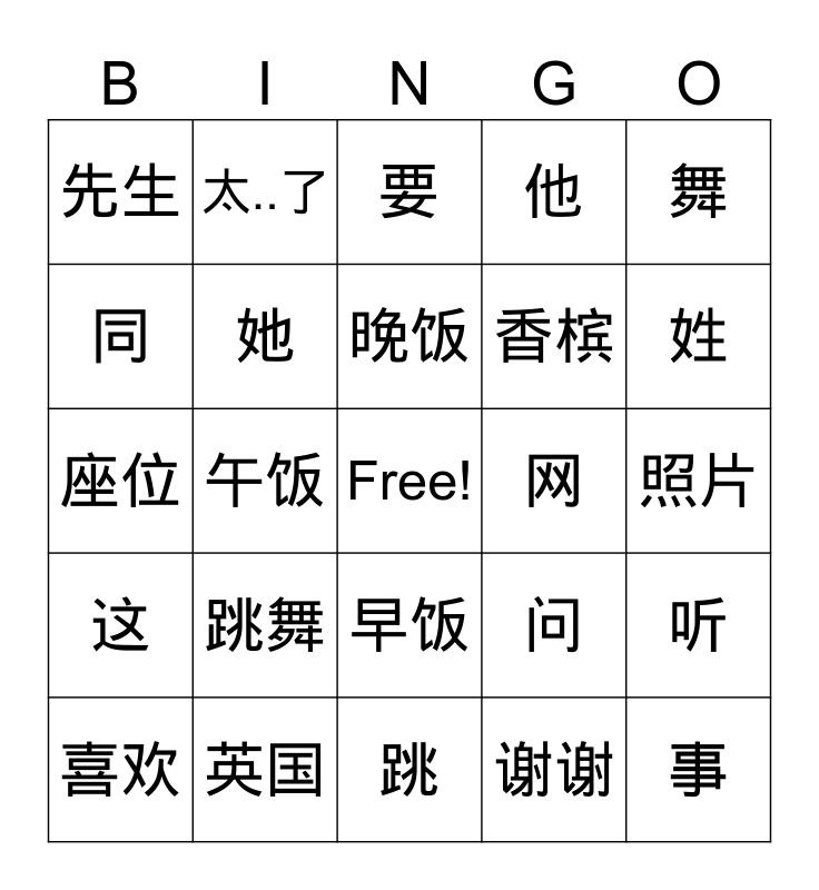 This bingo card has a free space and 51 words: Chinese, 事, 书, 跳, 跳舞, 天, 太..了, 泰国, 同, 同事, 她, 他, 听, 问, 威士忌, 晚, 晚饭, 网, 我, 舞, 午饭, 谢谢, 先生, 香槟, 小, 小姐, 姓, 西雅图, 喜欢, 要, 要, 意大利, 意思, 也, 音乐, 英国, 影, 有, 有的时候, 有意思, 照片, 这, 这里, 中国, 中文, 做, 座位, 在, 早, 早饭 and 爱尔兰.