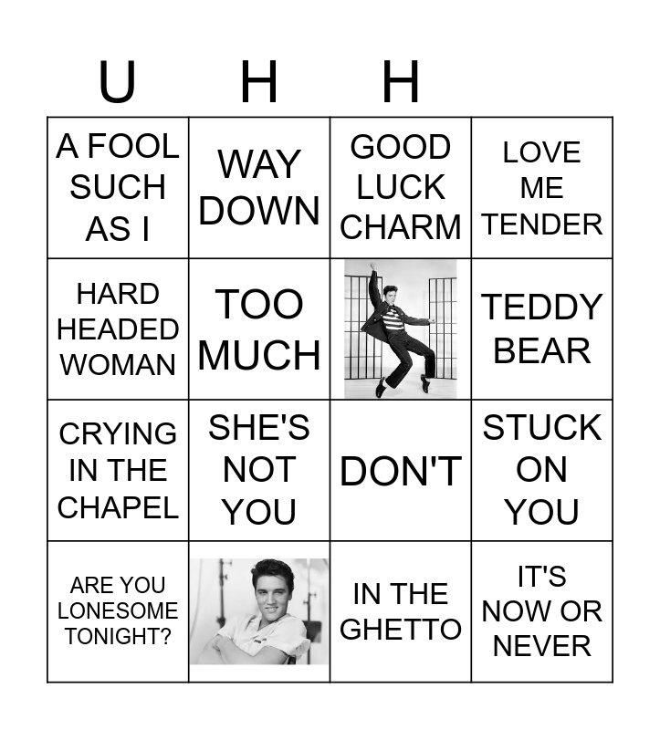 This bingo card has 4 images and 31 words: HEARTBREAK HOTEL, DON'T BE CRUEL, HOUND DOG, LOVE ME TENDER, TOO MUCH, ALL SHOOK UP, TEDDY BEAR, JAILHOUSE ROCK, DON'T, HARD HEADED WOMAN, ONE NIGHT, A FOOL SUCH AS I, A BIG HUNK O'LOVE, STUCK ON YOU, IT'S NOW OR NEVER, ARE YOU LONESOME TONIGHT?, WOODEN HEART, SURRENDER, MARIES THE NAME, CAN'T HELP FALLING IN LOVE WITH YOU, GOOD LUCK CHARM, SHE'S NOT YOU, RETURN TO SENDER, DEVIL IN DISGUISE, CRYING IN THE CHAPEL, IN THE GHETTO, SUSPICIOUS MINDS, WONDER OF YOU, BURNING LOVE, WAY DOWN and LITTLE LESS CONVERSATION.