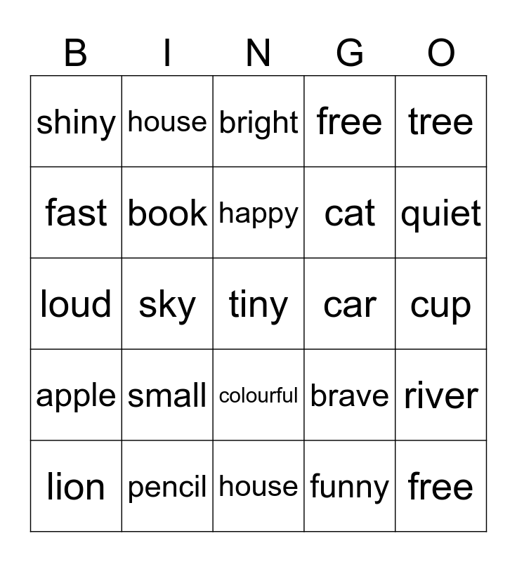 This bingo card has a free space and 24 words: small, pencil, happy, lion, tree, shiny, fast, house, car, colourful, cat, loud, brave, river, book, funny, cup, bright, quiet, sky, free, apple, free and house.