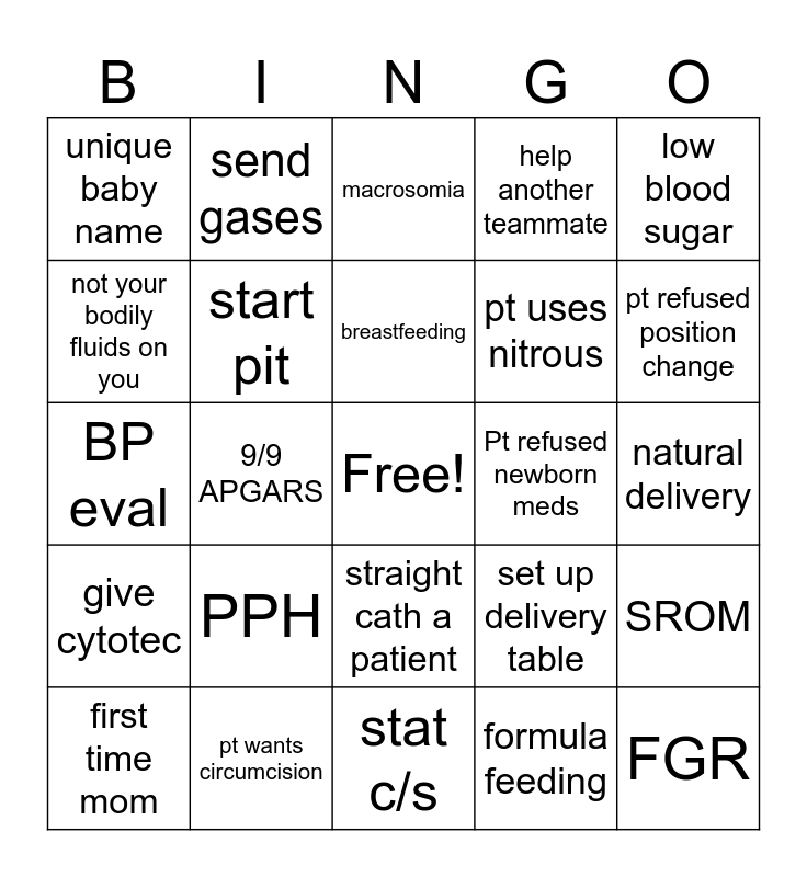This bingo card has a free space and 24 words: PPH, pt wants circumcision, breastfeeding, first time mom, low blood sugar, unique baby name, not your bodily fluids on you, send gases, Pt refused newborn meds, straight cath a patient, pt uses nitrous, BP eval, set up delivery table, SROM, start pit, formula feeding, natural delivery, macrosomia, pt refused position change, 9/9 APGARS, FGR, give cytotec, help another teammate and stat c/s.