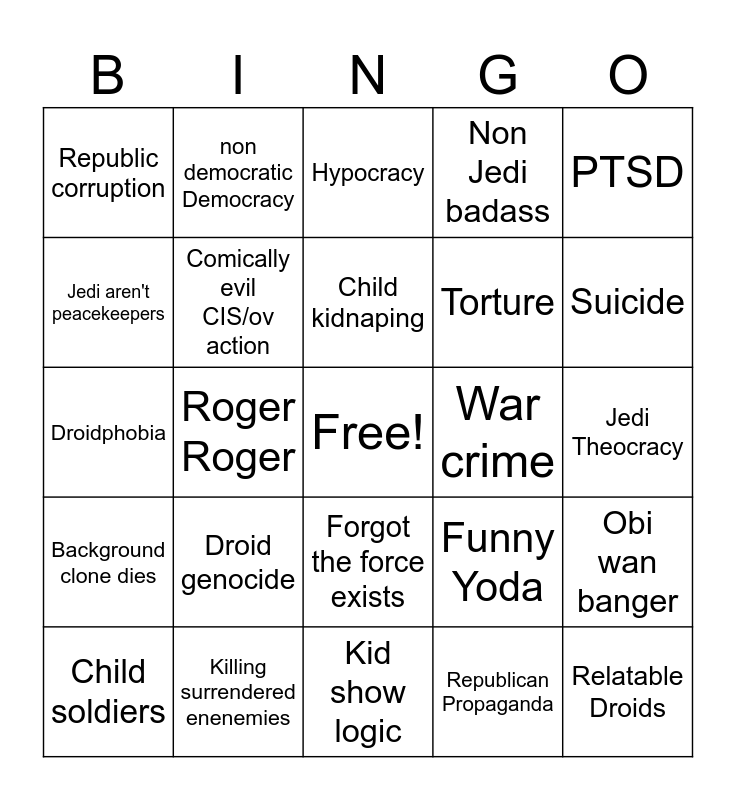 This bingo card has a free space and 24 words: Droid genocide, Killing surrendered enenemies, Child kidnaping, Child soldiers, PTSD, Republic corruption, Jedi aren't peacekeepers, non democratic Democracy, War crime, Forgot the force exists, Torture, Droidphobia, Funny Yoda, Obi wan banger, Comically evil CIS/ov action, Republican Propaganda, Jedi Theocracy, Hypocracy, Suicide, Roger Roger, Relatable Droids, Background clone dies, Non Jedi badass and Kid show logic.
