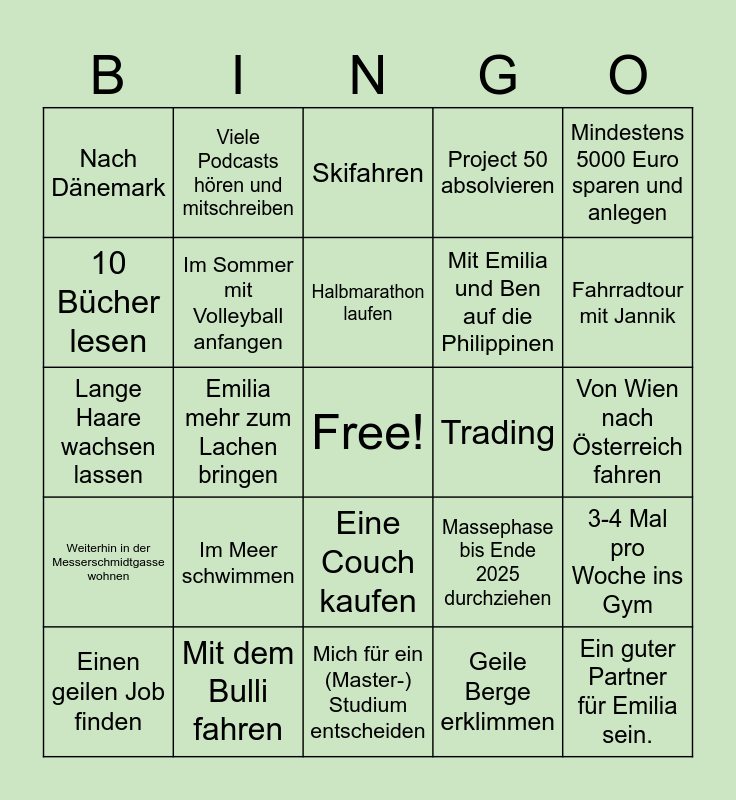 This bingo card has a free space and 24 words: Im Meer schwimmen, Mit dem Bulli fahren, Halbmarathon laufen, Einen geilen Job finden, Mindestens 5000 Euro sparen und anlegen, Nach Dänemark, 10 Bücher lesen, Viele Podcasts hören und mitschreiben, Trading, Eine Couch kaufen, Mit Emilia und Ben auf die Philippinen, Lange Haare wachsen lassen, Massephase bis Ende 2025 durchziehen, 3-4 Mal pro Woche ins Gym, Im Sommer mit Volleyball anfangen, Geile Berge erklimmen, Von Wien nach Österreich fahren, Skifahren, Fahrradtour mit Jannik, Emilia mehr zum Lachen bringen, Ein guter Partner für Emilia sein., Weiterhin in der Messerschmidtgasse wohnen, Project 50 absolvieren and Mich für ein (Master-) Studium entscheiden.
