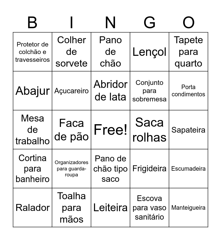This bingo card has a free space and 78 words: Baldes de plástico, Pá de lixo, Pano de chão, Porta sabão, Pregadores de roupa, Rodo, Vassouras, Esfregão, Escovinha de limpeza, Almofadas, Cobertor, Jogo de cama, Lençol, Protetor de colchão e travesseiros, Cabides, Abajur, Edredons, Organizadores para guarda-roupa, Protetor de colchão, Sapateira, Travesseiro, Tapete para quarto, Mesa de trabalho, Abridor de lata, Açucareiro, Formas e assadeiras, Afiador de facas, Panela de pressão, Descanso de panelas, Conjunto de xícaras, Porta condimentos, Espremedor, Leiteira, Copo de medida, Ralador, Saca rolhas, Pegador de macarrão, Porta papel toalha, Porta guardanapo, Manteigueira, Panos de prato, Avental, Lixeiras de cozinha, Chaleira, Colher de pau, Colher de sorvete, Concha, Jogo de panelas, pratos e talheres, Cortador de queijo, Escorredor de louça/macarrão/talheres, Escumadeira, Faca de pão, Frigideira, Tábua para cortes, Potes multiuso, Jarra, Garrafa térmica, Luva térmica, Porta detergente e esponja, Pano de chão tipo saco, Conjunto para sobremesa, Toalha de mesa, Rodinho de pia, Ralador, Saleiro, Jogo americano, Porta escova de dentes, Tapete antiaderente para box, Cortina para banheiro, Toalha para mãos, Toalhas de banho, Toalhas de rosto, Capacho, Cesto para roupa, Escova para vaso sanitário, Lixeira, Saboneteira and Roupão.