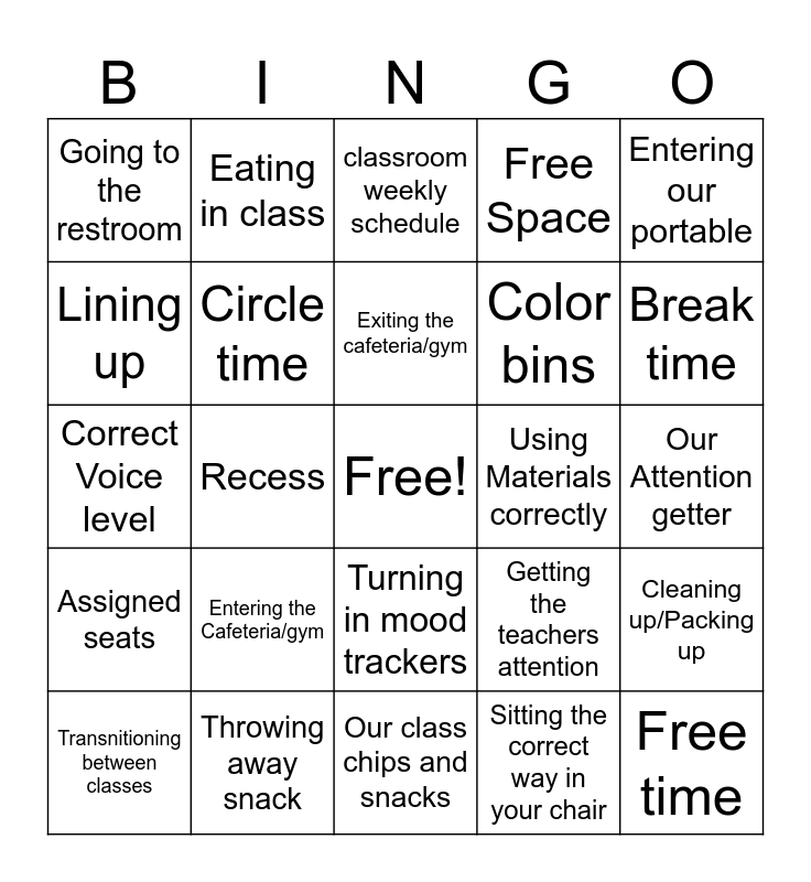 This bingo card has a free space and 24 words: Entering the Cafeteria/gym, Throwing away snack, Exiting the cafeteria/gym, Transnitioning between classes, Entering our portable, Going to the restroom, Lining up, Eating in class, Using Materials correctly, Turning in mood trackers, Color bins, Correct Voice level, Getting the teachers attention, Cleaning up/Packing up, Circle time, Sitting the correct way in your chair, Our Attention getter, classroom weekly schedule, Break time, Recess, Free time, Assigned seats, Free Space and Our class chips and snacks.