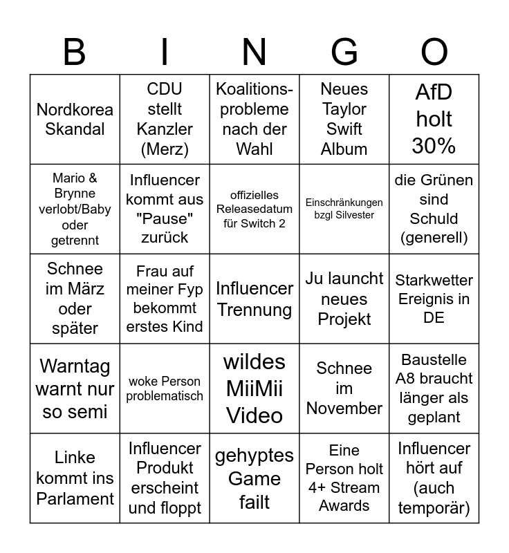 This bingo card has 25 words: woke Person problematisch, gehyptes Game failt, offizielles Releasedatum für Switch 2, Linke kommt ins Parlament, AfD holt 30%, Nordkorea Skandal, Mario & Brynne verlobt/Baby oder getrennt, CDU stellt Kanzler (Merz), Ju launcht neues Projekt, wildes MiiMii Video, Einschränkungen bzgl Silvester, Schnee im März oder später, Schnee im November, Baustelle A8 braucht länger als geplant, Influencer kommt aus "Pause" zurück, Influencer hört auf (auch temporär), Starkwetter Ereignis in DE, Koalitions-probleme nach der Wahl, die Grünen sind Schuld (generell), Frau auf meiner Fyp bekommt erstes Kind, Influencer Trennung, Influencer Produkt erscheint und floppt, Warntag warnt nur so semi, Neues Taylor Swift Album and Eine Person holt 4+ Stream Awards.