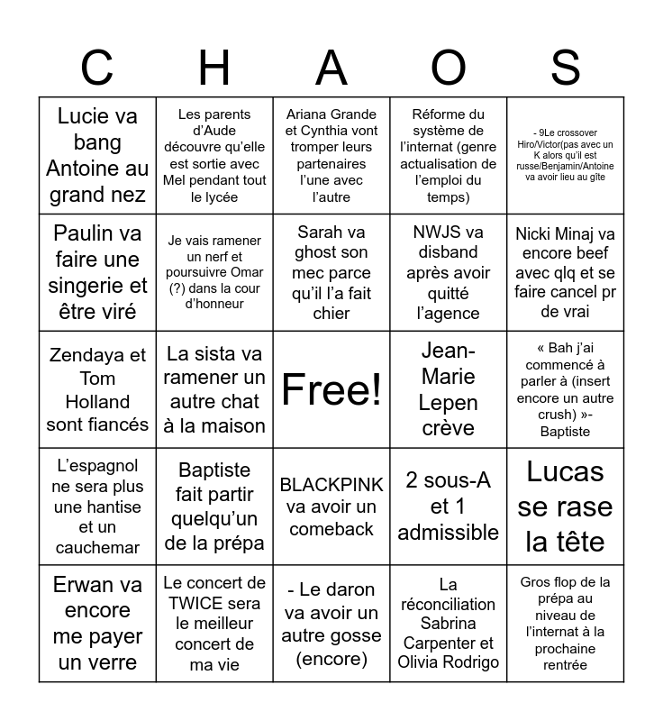 This bingo card has a free space and 24 words: Baptiste fait partir quelqu’un de la prépa, Le concert de TWICE sera le meilleur concert de ma vie, Sarah va ghost son mec parce qu’il l’a fait chier, Erwan va encore me payer un verre, - 9Le crossover Hiro/Victor(pas avec un K alors qu’il est russe/Benjamin/Antoine va avoir lieu au gîte, Lucie va bang Antoine au grand nez, Paulin va faire une singerie et être viré, Les parents d’Aude découvre qu’elle est sortie avec Mel pendant tout le lycée, Jean-Marie Lepen crève, BLACKPINK va avoir un comeback, NWJS va disband après avoir quitté l’agence, Zendaya et Tom Holland sont fiancés, 2 sous-A et 1 admissible, Lucas se rase la tête, Je vais ramener un nerf et poursuivre Omar (?) dans la cour d’honneur, La réconciliation Sabrina Carpenter et Olivia Rodrigo, « Bah j’ai commencé à parler à (insert encore un autre crush) »- Baptiste, Ariana Grande et Cynthia vont tromper leurs partenaires l’une avec l’autre, Nicki Minaj va encore beef avec qlq et se faire cancel pr de vrai, La sista va ramener un autre chat à la maison, Gros flop de la prépa au niveau de l’internat à la prochaine rentrée, L’espagnol ne sera plus une hantise et un cauchemar, Réforme du système de l’internat (genre actualisation de l’emploi du temps) and - Le daron va avoir un autre gosse (encore).