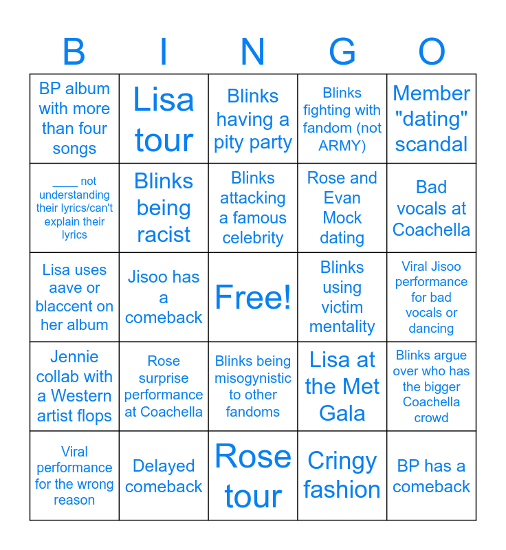 This bingo card has a free space and 35 words: BP paved the way/argument, Cringy lyrics, Lipsynced or not?, Blinks being racist, Blinks being misogynistic to other fandoms, Blinks fighting with fandom (not ARMY), ____ not understanding their lyrics/can't explain their lyrics, Flexing designer brands, Blinks attacking a famous celebrity, ____ celeb was there to see ____ perform, Lisa uses aave or blaccent on her album, Member "dating" scandal, Blinks trending apologize to ____ member, BP new album, BP album with more than four songs, Blinks using victim mentality, Cringy fashion, Jisoo has a comeback, Jennie collab with a Western artist flops, BP has a comeback, Lisa at the Met Gala, Viral performance for the wrong reason, Blinks argue over who has the bigger Coachella crowd, Delayed comeback, Blinks having a pity party, Bad vocals at Coachella, Delay in group comeback, Another Lisa song about Frederick, Rose and Evan Mock dating, Viral Jisoo performance for bad vocals or dancing, Lisa twerking at Coachella, Rose tour, Rose surprise performance at Coachella, Lisa tour and Blinks attack ___ a kpop artist (not BTS).