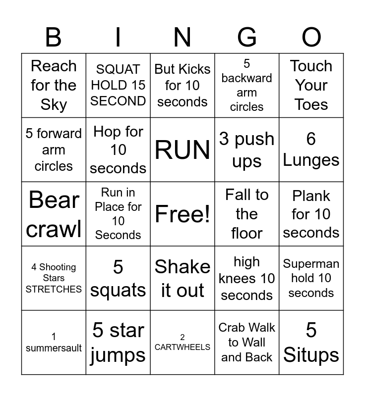 This bingo card has a free space and 24 words: 5 squats, 5 star jumps, RUN, 1 summersault, Touch Your Toes, Reach for the Sky, 5 forward arm circles, SQUAT HOLD 15 SECOND, Fall to the floor, Shake it out, 3 push ups, Bear crawl, high knees 10 seconds, Superman hold 10 seconds, Hop for 10 seconds, Crab Walk to Wall and Back, Plank for 10 seconds, But Kicks for 10 seconds, 6 Lunges, Run in Place for 10 Seconds, 5 Situps, 4 Shooting Stars STRETCHES, 5 backward arm circles and 2 CARTWHEELS.