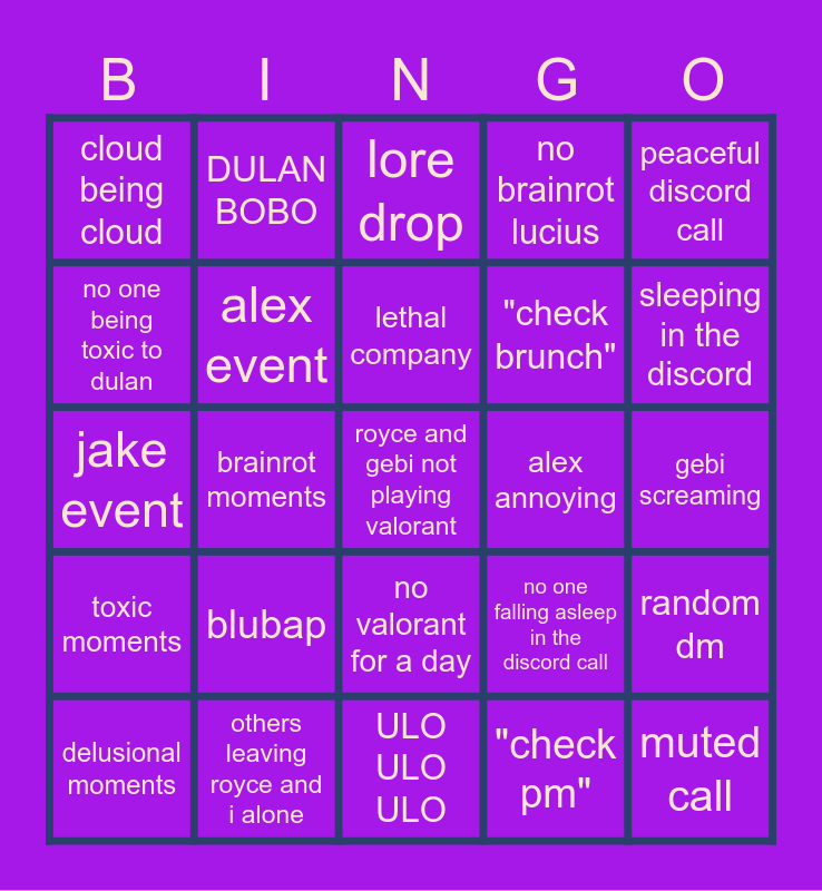 This bingo card has 40 words: max event, jake event, leila event, alex event, others leaving royce and i alone, no valorant for a day, lethal company, cloud being normal, peaceful discord call, toxic moments, brainrot moments, no brainrot lucius, royce and gebi not playing valorant, gebi screaming, alex annoying, blubap, league op legends, cloud being cloud, ED, lore drop, random dm, "check pm", "check brunch", no one being toxic to dulan, blaming lucius, blaming dulan, blaming gebi, epic the musical, muted call, deafened call, random camera moments, delusional moments, fin event, no one falling asleep in the discord call, sleeping in the discord, ULO ULO ULO, ALEX KALBO, royce disconnecting, DULAN BOBO and everyone speaking at the same time.