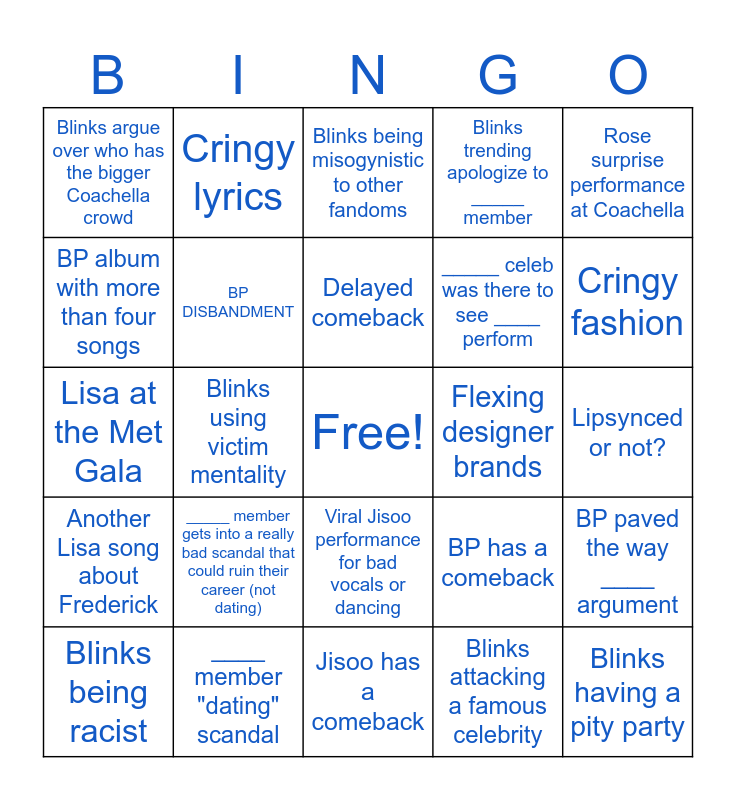 This bingo card has a free space and 26 words: Viral Jisoo performance for bad vocals or dancing, Blinks attacking a famous celebrity, Delayed comeback, ____ member "dating" scandal, Rose surprise performance at Coachella, Blinks argue over who has the bigger Coachella crowd, BP album with more than four songs, Cringy lyrics, Lipsynced or not?, BP has a comeback, _____ celeb was there to see ____ perform, Lisa at the Met Gala, BP paved the way ____ argument, Blinks being racist, Blinks using victim mentality, Jennie collab with a Western artist flops, Blinks trending apologize to _____ member, Another Lisa song about Frederick, Blinks being misogynistic to other fandoms, Blinks having a pity party, Cringy fashion, Jisoo has a comeback, Flexing designer brands, _____ member gets into a really bad scandal that could ruin their career (not dating), BP DISBANDMENT and Blinks hate on Lady Gaga.