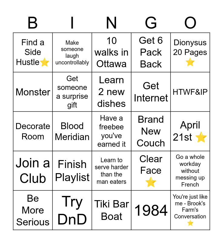 This bingo card has a free space and 24 words: Finish Playlist, Try DnD, Learn 2 new dishes, Be More Serious, Dionysus 20 Pages ⭐, Find a Side Hustle⭐, Monster, Make someone laugh uncontrollably, Brand New Couch, Learn to serve harder than the man eaters, Get Internet, Decorate Room, Clear Face ⭐, Go a whole workday without messing up French, Get someone a surprise gift, 1984, April 21st ⭐, 10 walks in Ottawa, HTWF&IP, Blood Meridian, You're just like me - Brook's Farm's Conversation ⭐, Join a Club, Get 6 Pack Back and Tiki Bar Boat.