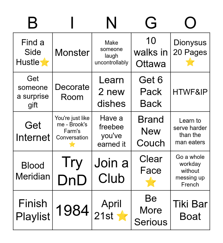 This bingo card has a free space and 24 words: Finish Playlist, Try DnD, Learn 2 new dishes, Be More Serious, Dionysus 20 Pages ⭐, Find a Side Hustle⭐, Monster, Make someone laugh uncontrollably, Brand New Couch, Learn to serve harder than the man eaters, Get Internet, Decorate Room, Clear Face ⭐, Go a whole workday without messing up French, Get someone a surprise gift, 1984, April 21st ⭐, 10 walks in Ottawa, HTWF&IP, Blood Meridian, You're just like me - Brook's Farm's Conversation ⭐, Join a Club, Get 6 Pack Back and Tiki Bar Boat.