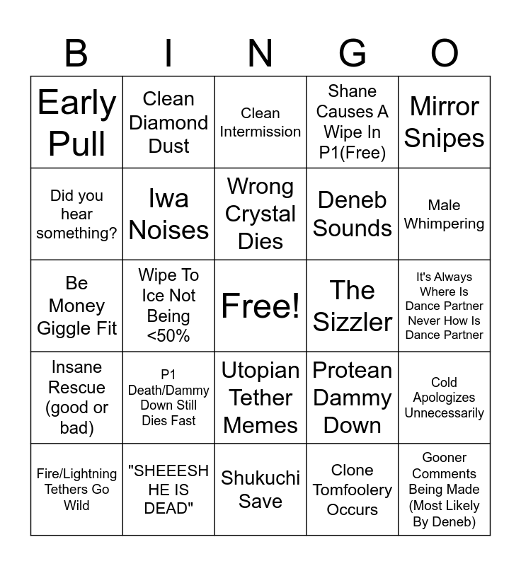 This bingo card has a free space and 24 words: P1 Death/Dammy Down Still Dies Fast, "SHEEESH HE IS DEAD", Wrong Crystal Dies, Fire/Lightning Tethers Go Wild, Mirror Snipes, Early Pull, Did you hear something?, Clean Diamond Dust, The Sizzler, Utopian Tether Memes, Deneb Sounds, Be Money Giggle Fit, Protean Dammy Down, Cold Apologizes Unnecessarily, Iwa Noises, Clone Tomfoolery Occurs, It's Always Where Is Dance Partner Never How Is Dance Partner, Clean Intermission, Male Whimpering, Wipe To Ice Not Being <50%, Gooner Comments Being Made (Most Likely By Deneb), Insane Rescue (good or bad), Shane Causes A Wipe In P1(Free) and Shukuchi Save.
