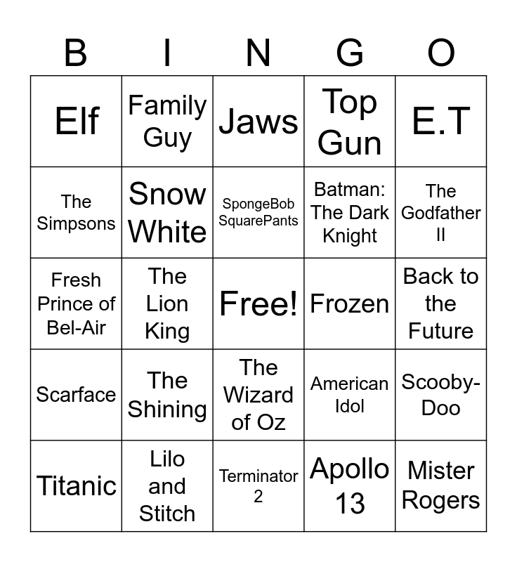 This bingo card has a free space and 30 words: Lilo and Stitch, Finding Nemo, The Lion King, Toy Story, Elf, Jaws, Snow White, The Wizard of Oz, Frozen, Terminator 2, Back to the Future, Mister Rogers, Apollo 13, Friends, The Godfather II, How I Met Your Mother, American Idol, Scarface, The Shining, E.T, Fresh Prince of Bel-Air, Star Wars, Family Guy, Batman: The Dark Knight, The Simpsons, Top Gun, Scooby-Doo, Titanic, SpongeBob SquarePants and Family Matters.