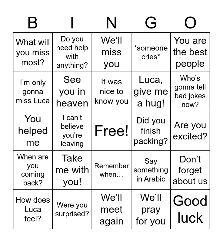 This bingo card has a free space and 30 words: Were you surprised?, You are welcome to visit us, I can’t believe you’re leaving, We love you, What will you miss most?, We’ll miss you, See you in heaven, Remember when…, Did you finish packing?, We’ll meet again, Are you excited?, Good luck, We’ll pray for you, Thank you, Who’s gonna tell bad jokes now?, Send pictures, Say something in Arabic, When are you coming back?, Take me with you!, You are the best people, You helped me, I learned a lot from you, Do you need help with anything?, Luca, give me a hug!, I’m only gonna miss Luca, *someone cries*, Don’t forget about us, How does Luca feel?, It was nice to know you and This is not a goodbye.