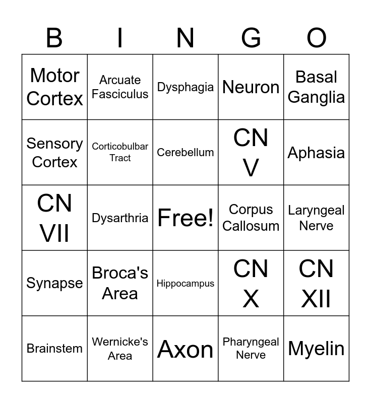 This bingo card has a free space and 24 words: Broca's Area, Wernicke's Area, Cerebellum, Brainstem, Basal Ganglia, Motor Cortex, Sensory Cortex, Arcuate Fasciculus, Corpus Callosum, Hippocampus, CN V, CN VII, CN X, CN XII, Corticobulbar Tract, Pharyngeal Nerve, Laryngeal Nerve, Dysphagia, Aphasia, Dysarthria, Myelin, Synapse, Neuron and Axon.