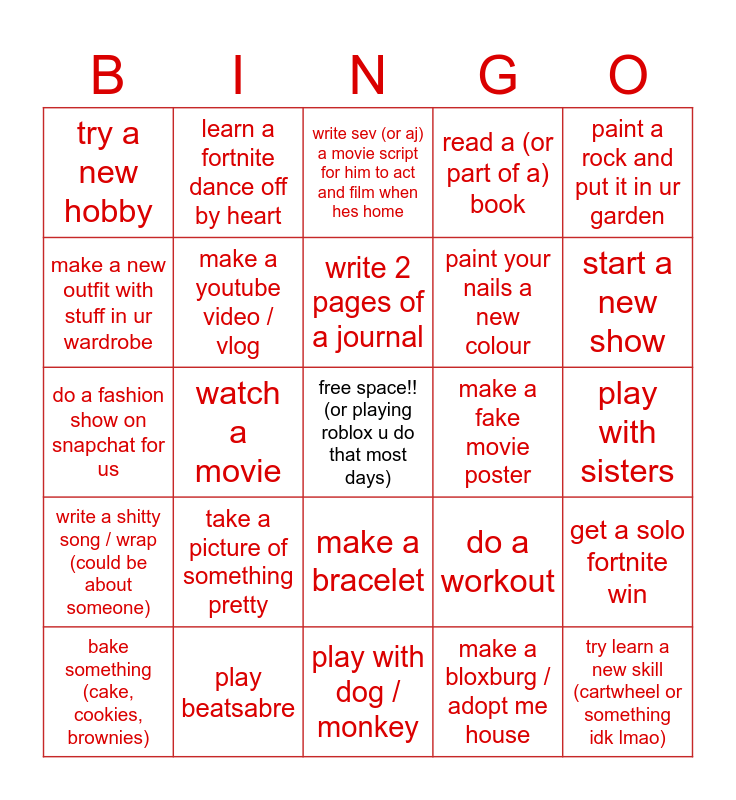 This bingo card has a free space and 39 words: start a new story game (tlou, life is strange), make a drawing, make a teddy out of a sock, make a youtube video / vlog, bake something (cake, cookies, brownies), make a bracelet, write 2 pages of a journal, go on a walk, paint a rock and put it in ur garden, write a shitty song / wrap (could be about someone), watch a movie, read a (or part of a) book, try learn a new skill (cartwheel or something idk lmao), play with sisters, make a fake movie poster, take a picture of something pretty, do a lesson online / in a book, try a new hobby, try doing a new hairstyle (fishtail braid), do a workout, make a new outfit with stuff in ur wardrobe, play with dog / monkey, paint your nails a new colour, start a new show, learn a card game with ur mum or sisters, just dance (youtube), do makeup / facepaint of something stupid or funny, tidy your room (while singing) (its fun when ur in the mood), send us videos of you dancing to music, learn a fortnite dance off by heart, learn a song off by heart, do a sock puppet show and send it to us, write sev (or aj) a movie script for him to act and film when hes home, play beatsabre, make a bloxburg / adopt me house, do a drawing of spiderman and show us, get a solo fortnite win, do a fashion show on snapchat for us and do 10 pushups 😈.