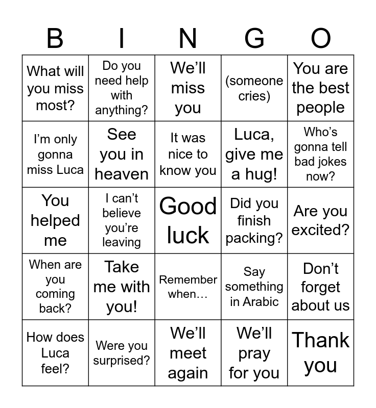 This bingo card has 30 words: Were you surprised?, You are welcome to visit us, I can’t believe you’re leaving, We love you, What will you miss most?, We’ll miss you, See you in heaven, Remember when…, Did you finish packing?, We’ll meet again, Are you excited?, Good luck, We’ll pray for you, Thank you, Who’s gonna tell bad jokes now?, Send pictures, Say something in Arabic, When are you coming back?, Take me with you!, You are the best people, You helped me, I learned a lot from you, Do you need help with anything?, Luca, give me a hug!, I’m only gonna miss Luca, (someone cries), Don’t forget about us, How does Luca feel?, It was nice to know you and This is not a goodbye.