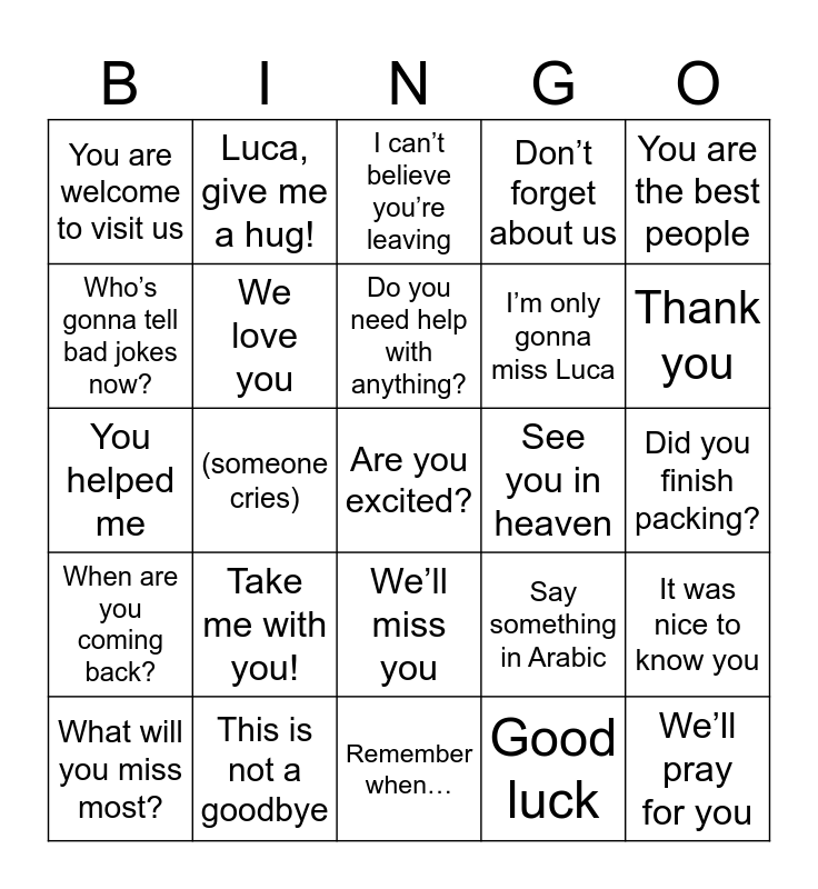 This bingo card has 30 words: This is not a goodbye, We’ll meet again, (someone cries), How does Luca feel?, You are welcome to visit us, I can’t believe you’re leaving, We love you, We’ll miss you, See you in heaven, Remember when…, Did you finish packing?, Are you excited?, Good luck, We’ll pray for you, Thank you, Send pictures, Say something in Arabic, When are you coming back?, Take me with you!, You are the best people, You helped me, I learned a lot from you, Luca, give me a hug!, I’m only gonna miss Luca, Who’s gonna tell bad jokes now?, Don’t forget about us, It was nice to know you, What will you miss most?, Do you need help with anything? and Were you surprised?.